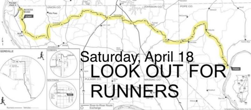 If you will be traveling through Union, Johnson or Pope Counties on Saturday please use caution. There will be runners on the road, team vans/vehicles, and volunteers at the Exchange Areas. The course includes portions of Highway 127, Route 51, and Route 37.