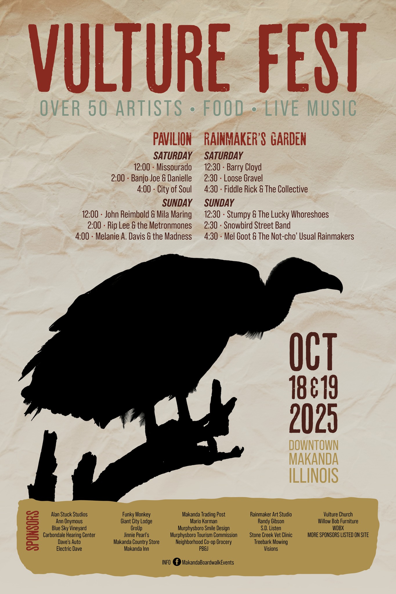 Each fall, vultures soar and glide over Makanda and the surrounding areas and signal the beginning of fall and the arrival of the incredible fall colors of Makanda and southern Illinois. Vulture Fest features live music, food, shopping, and art by local artists for purchase.